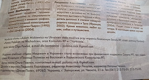 Projekt badania twórczości poety A. Mickiewicza na Ukrainie z punktu widzenia malarzy polskiego pochodzenia Stowarzyszenia stał możliwym przy wsparciu Senatu RP i Konsulatu Generalnemu wRP w Charkowie. Projekt zaowocował wydaniem prac malarzy po miejscam wędruwek poety po Ukrainie czyli Albumem „Zobaczyć świat oczami poety". A. Mickiewicz na Ukrainie To piewsze wydanie w świecie, które pokazuje twóczość wybitnego poety pzez świat malazy-odaków.